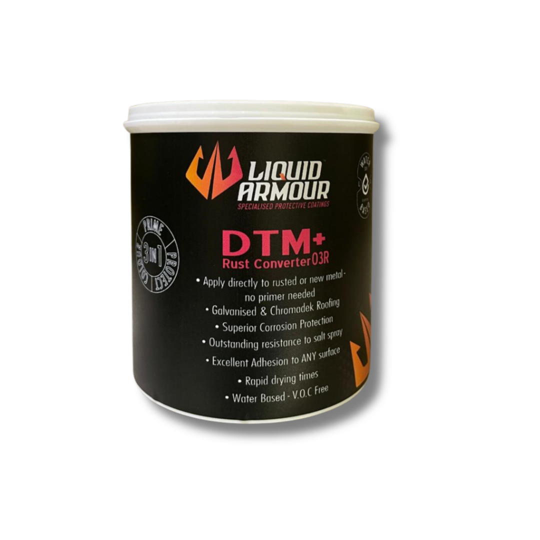 DTM+03R by Liquid Armour, is a rust converter with a chemical additive or component that reacts with existing rust (iron oxide) on metal surfaces to chemically stabilize and neutralize it, turning it into a non-reactive, paintable surface.